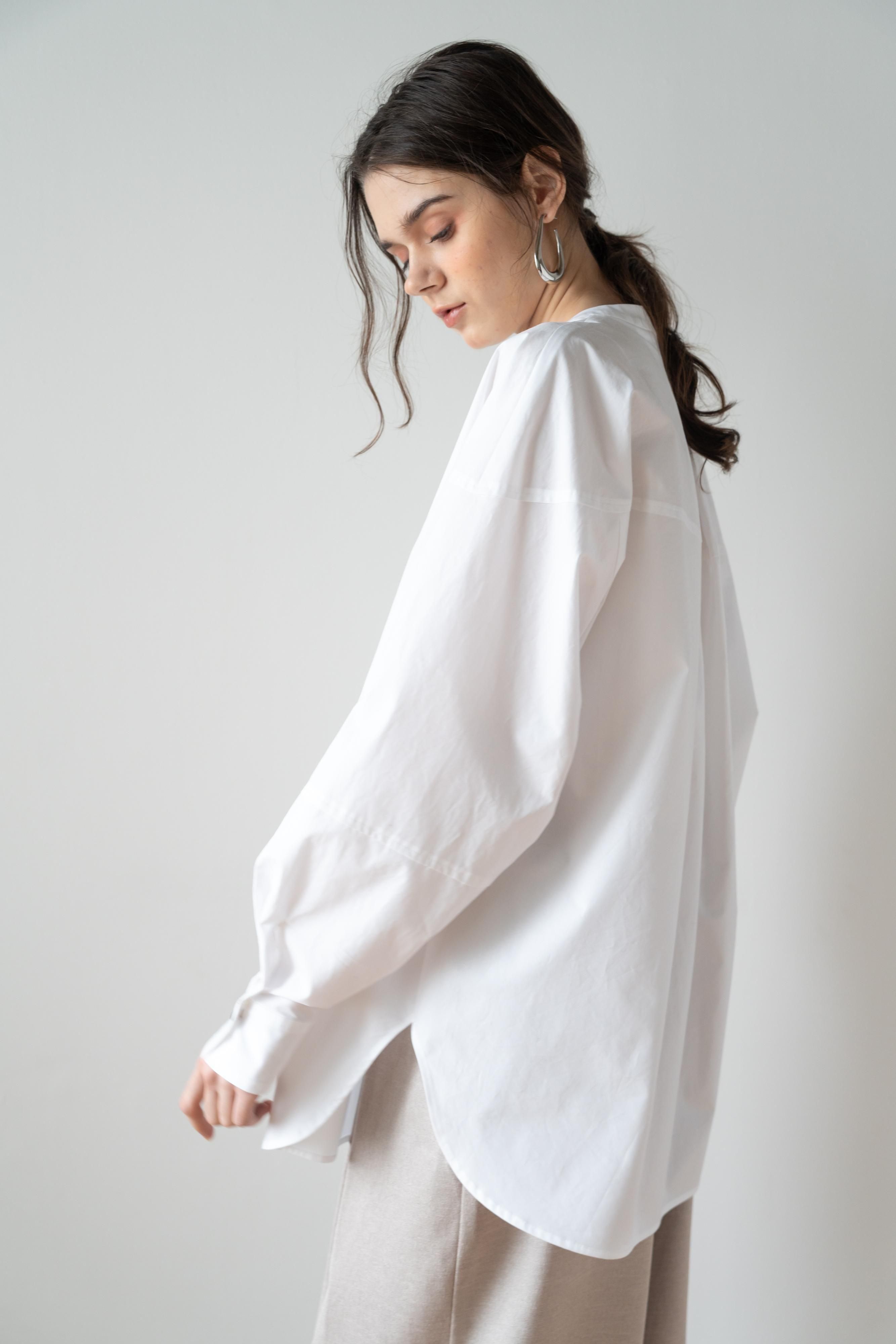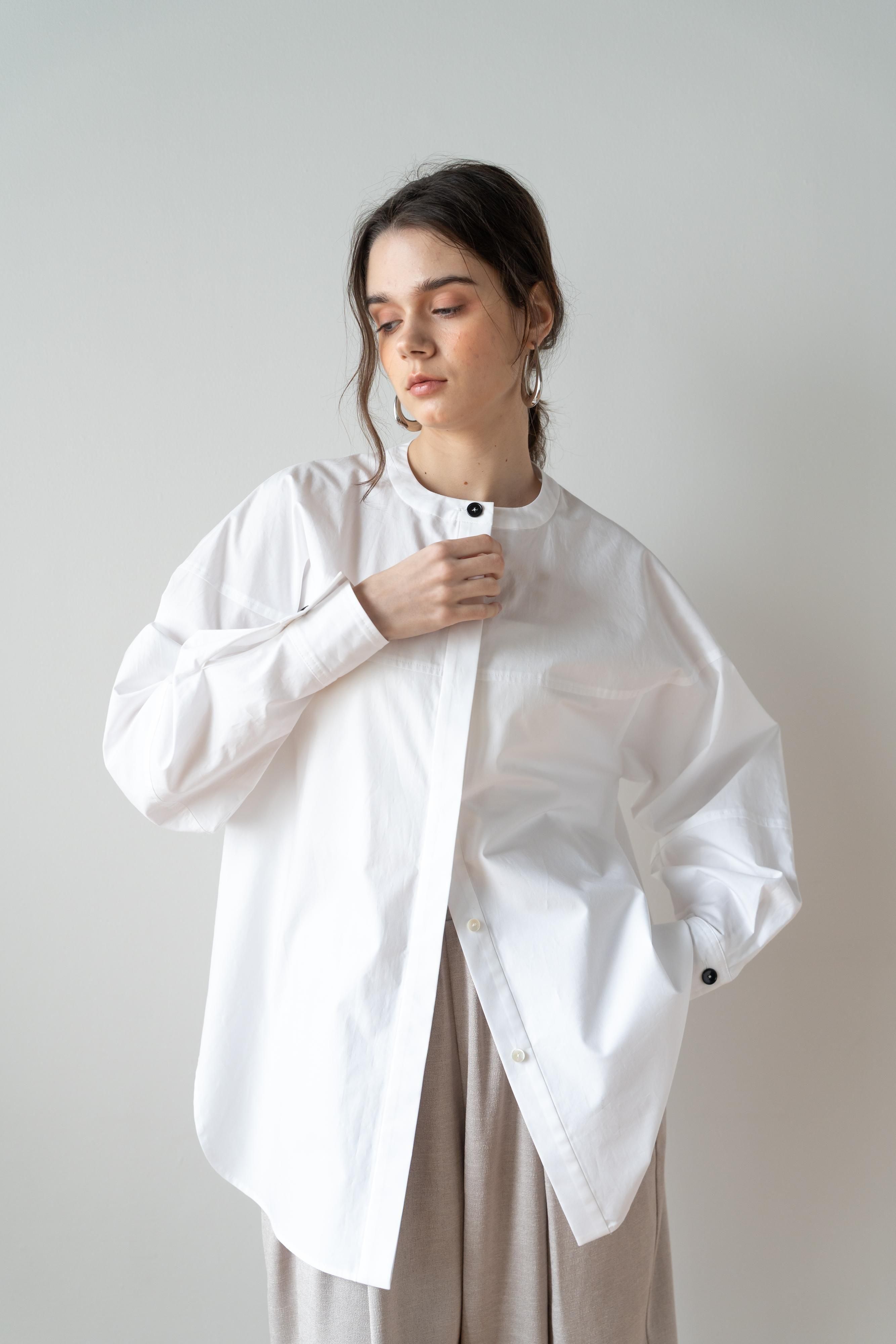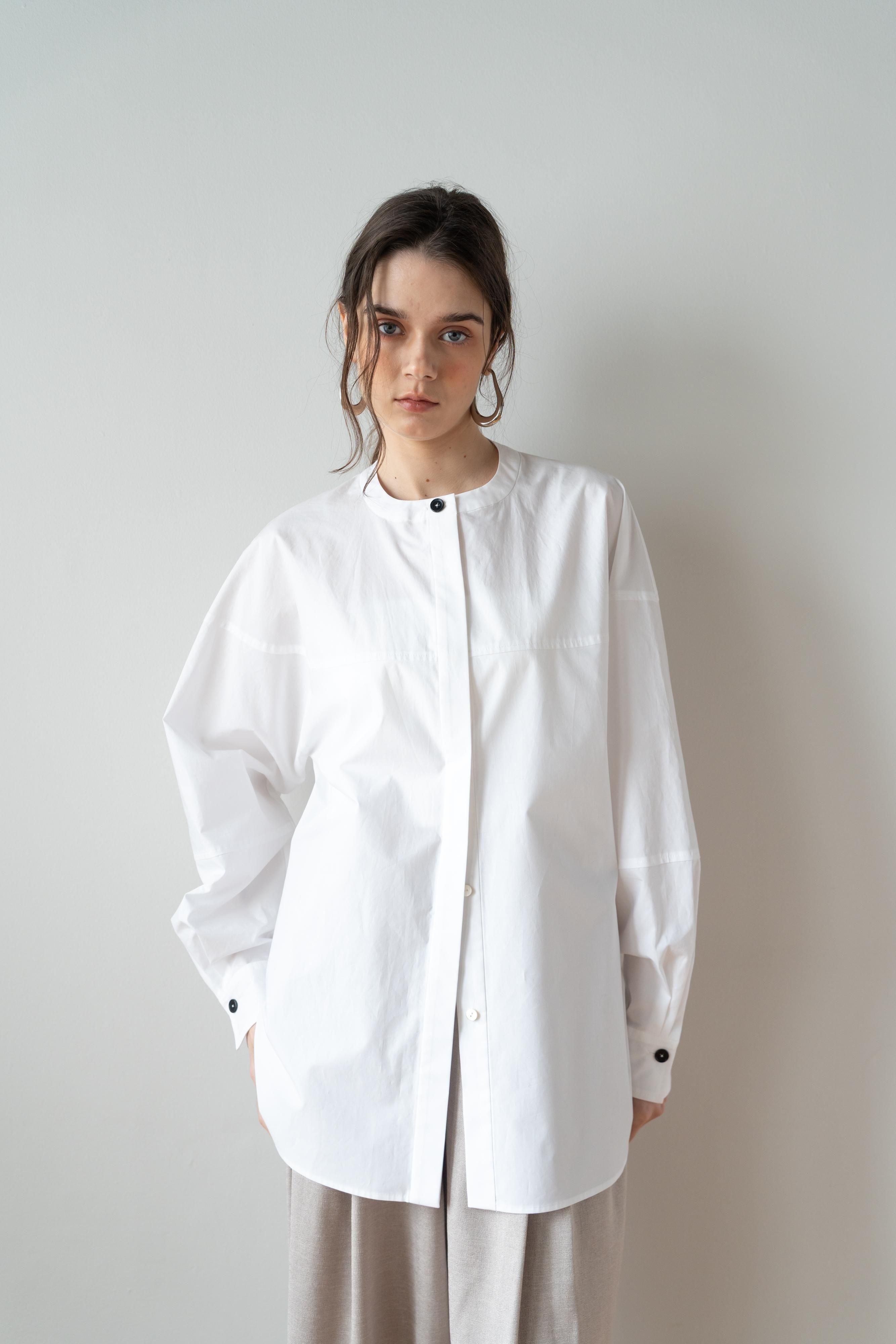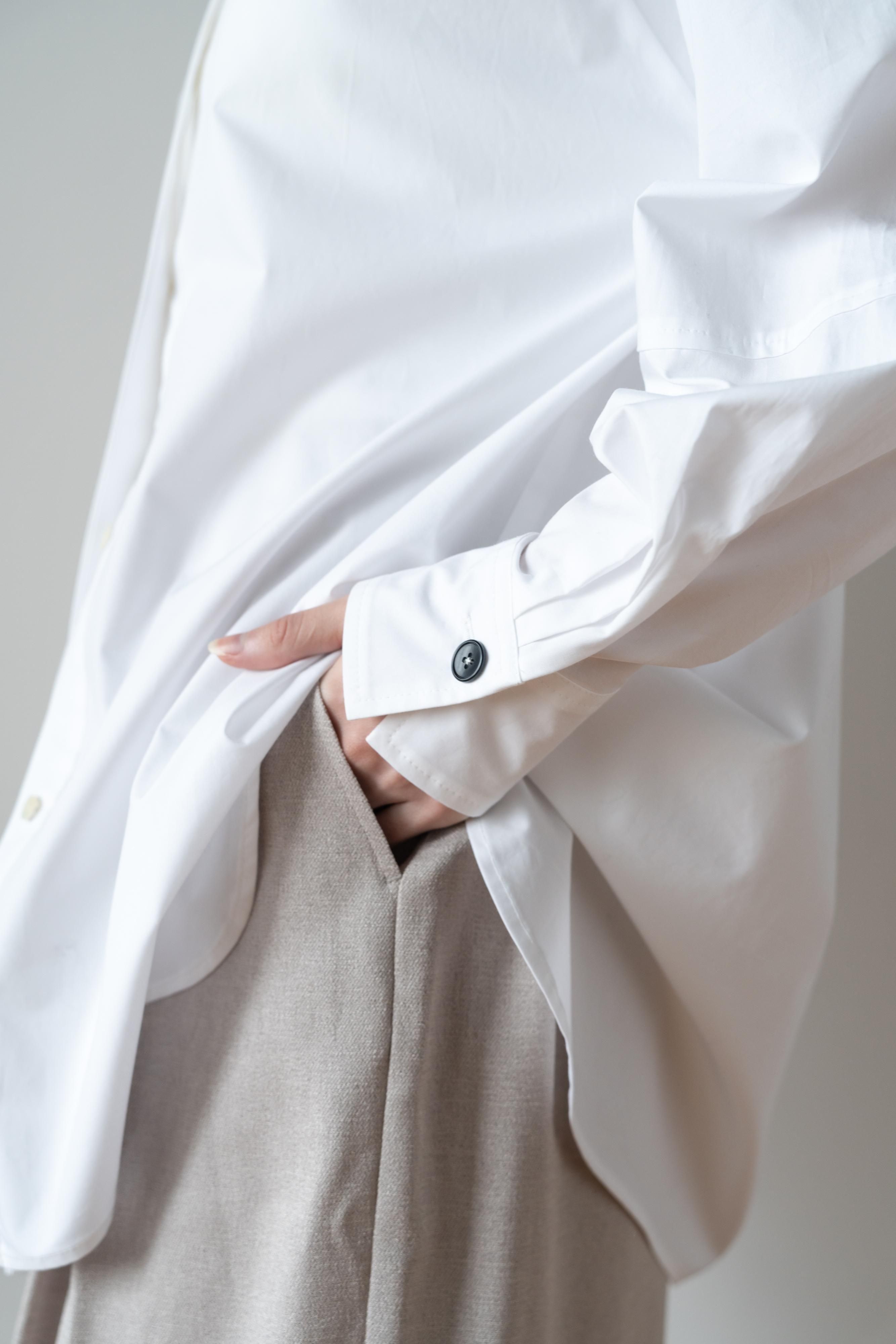 特徴的な黒ボタンがポイントの一枚。オーバーサイズでゆったりとした着心地が魅力で、日本製のコットン生地を使用しているので、肌触りも抜群です。後ろ身頃には深めのタックが入っており、程よい立体感のあるコクーンシルエットに仕上げられています。