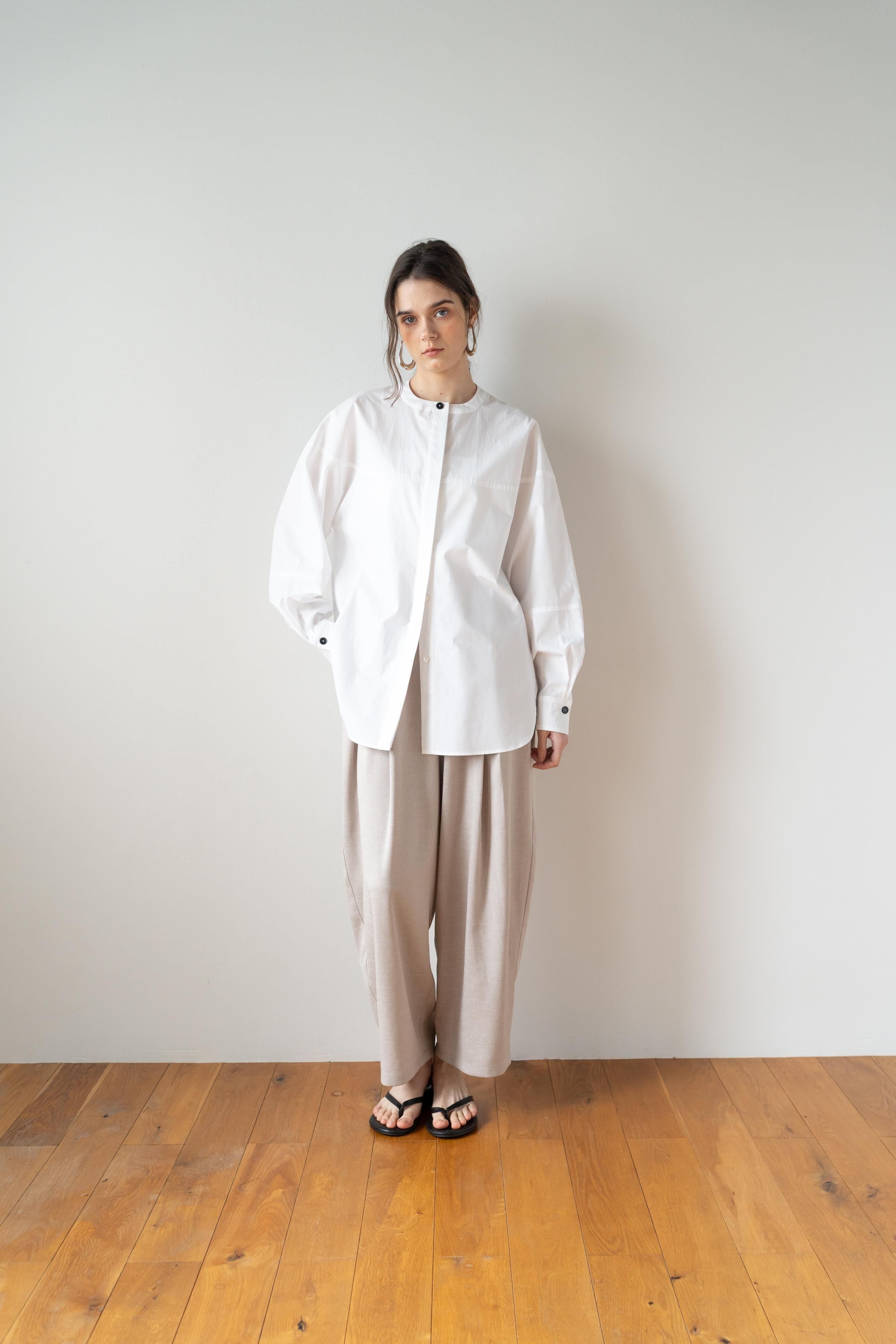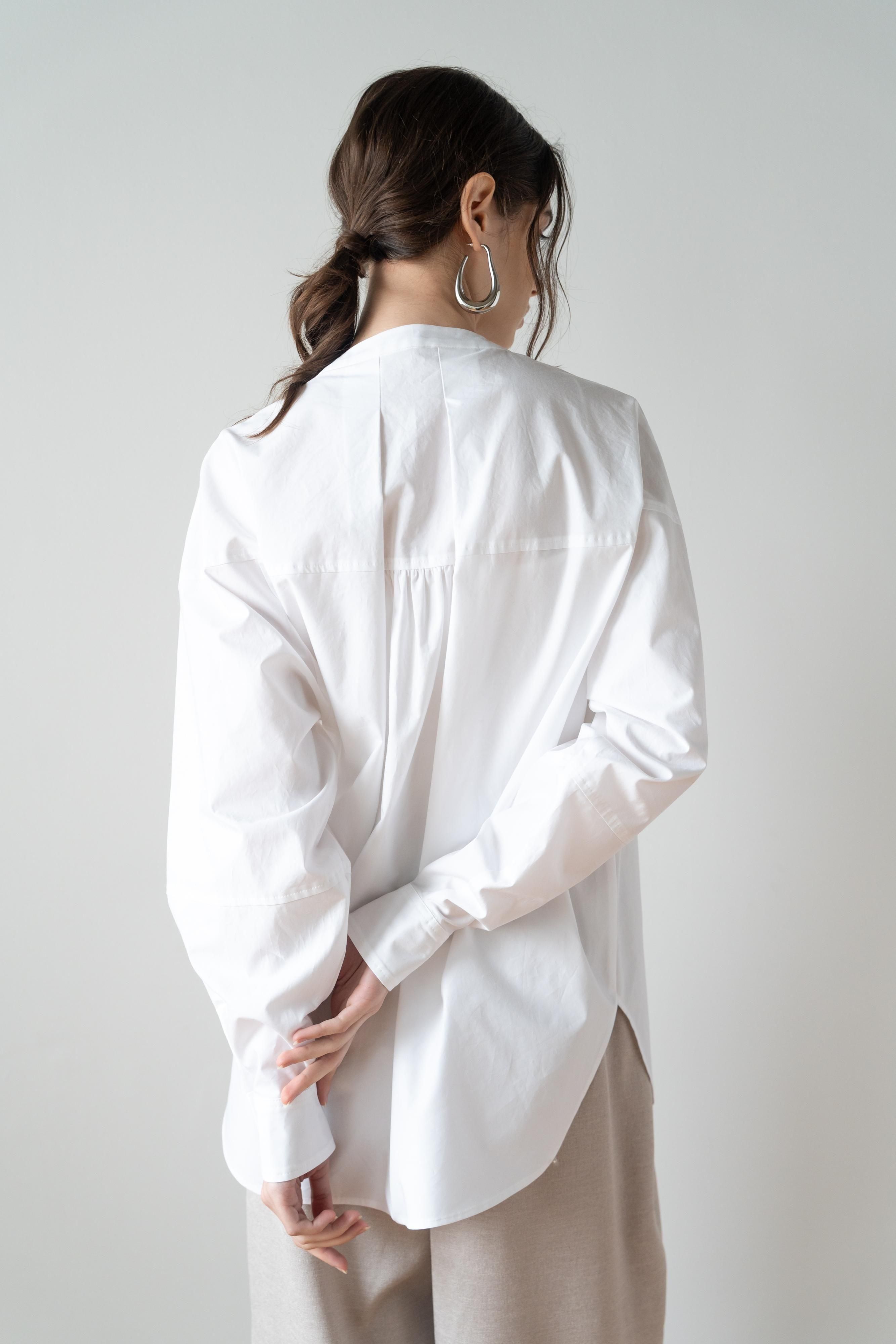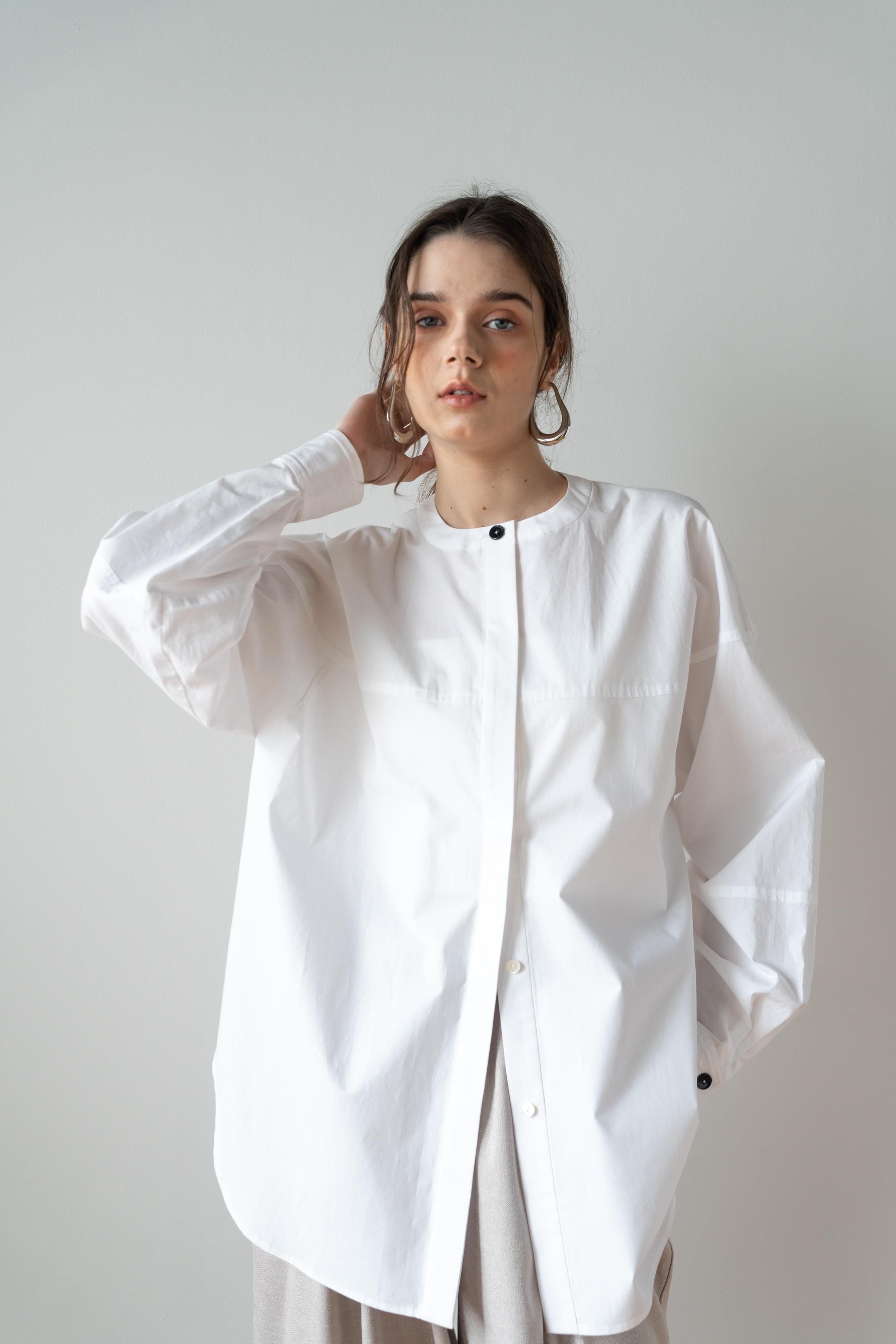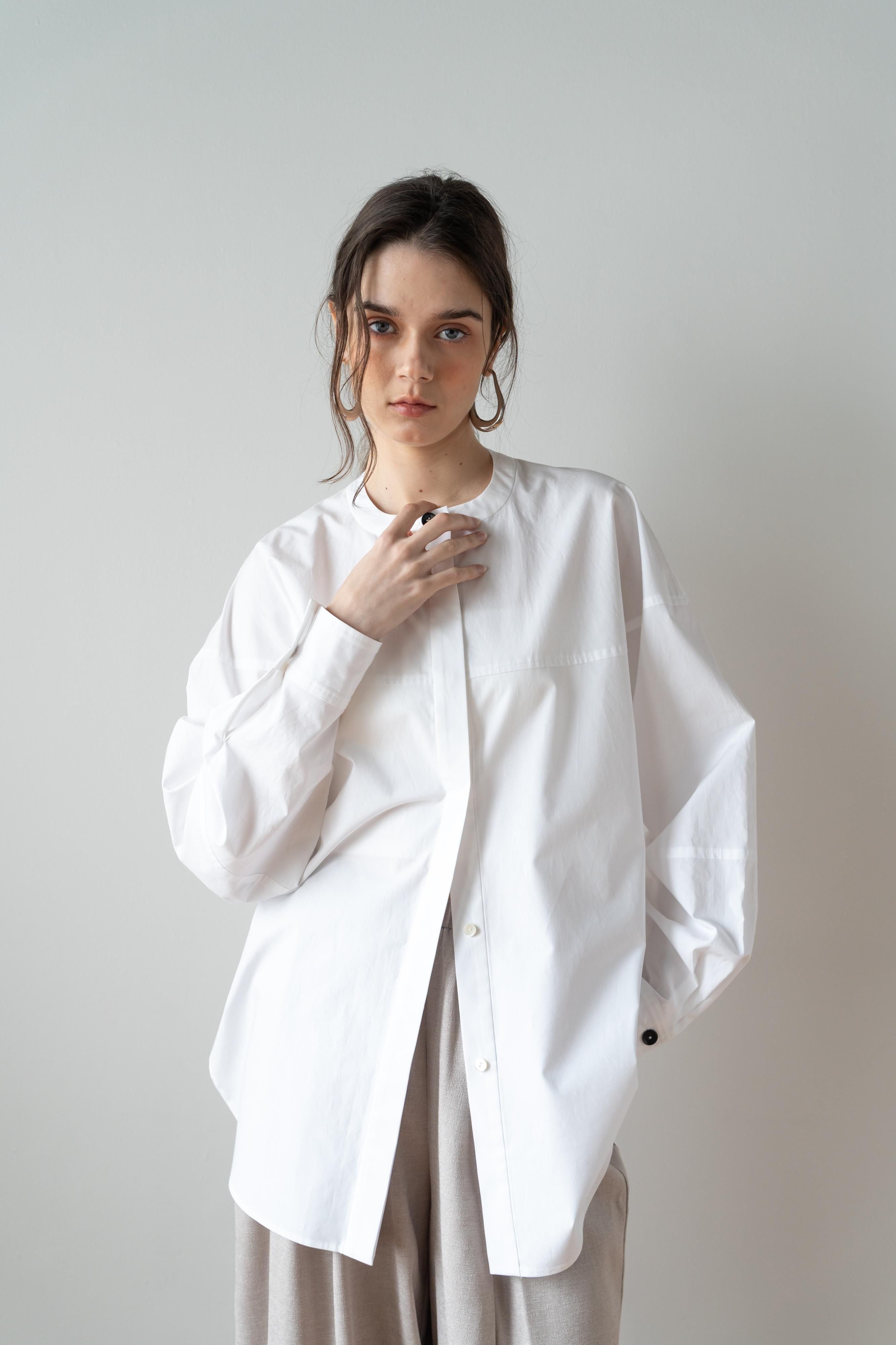 特徴的な黒ボタンがポイントの一枚。オーバーサイズでゆったりとした着心地が魅力で、日本製のコットン生地を使用しているので、肌触りも抜群です。後ろ身頃には深めのタックが入っており、程よい立体感のあるコクーンシルエットに仕上げられています。