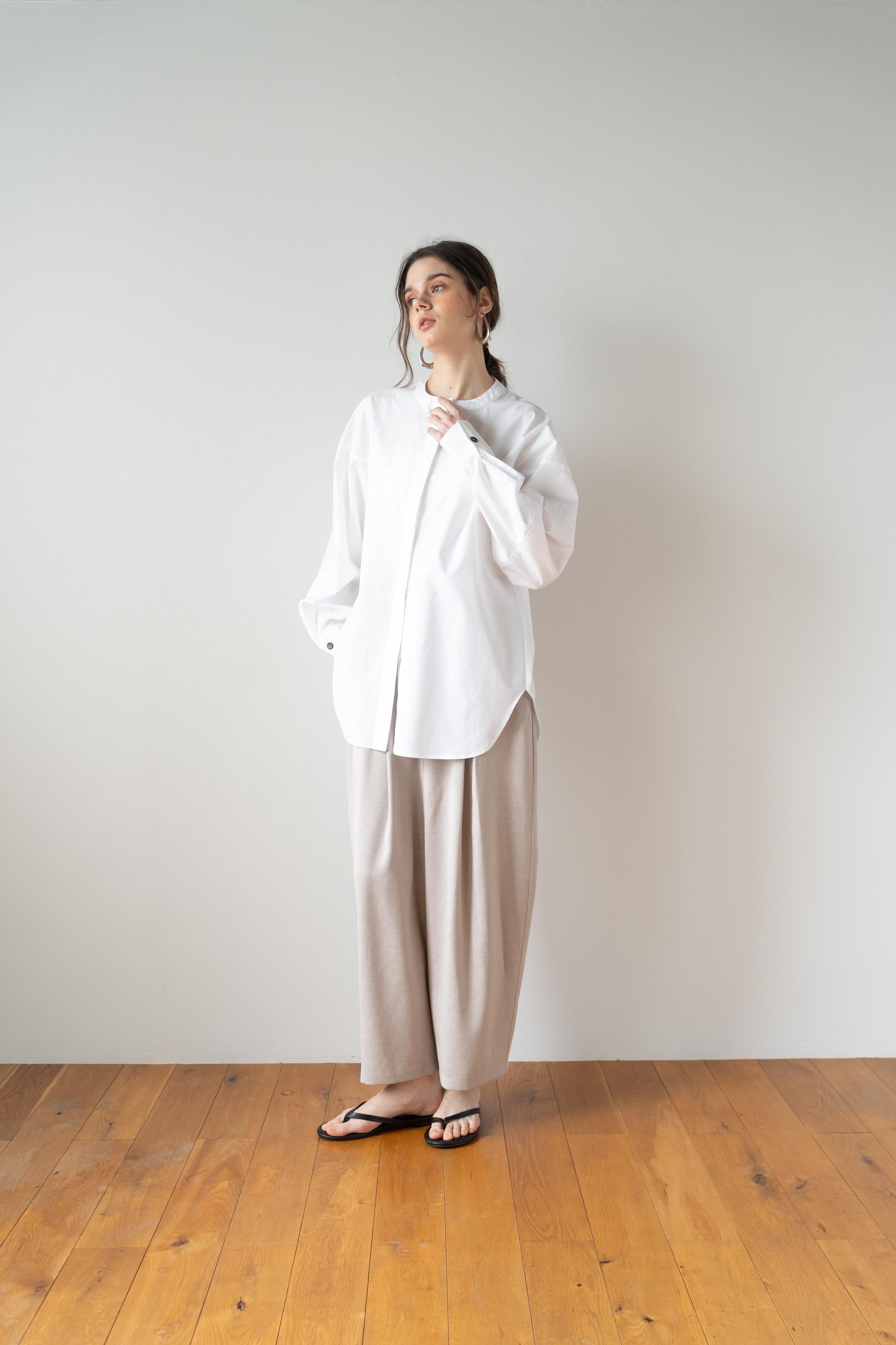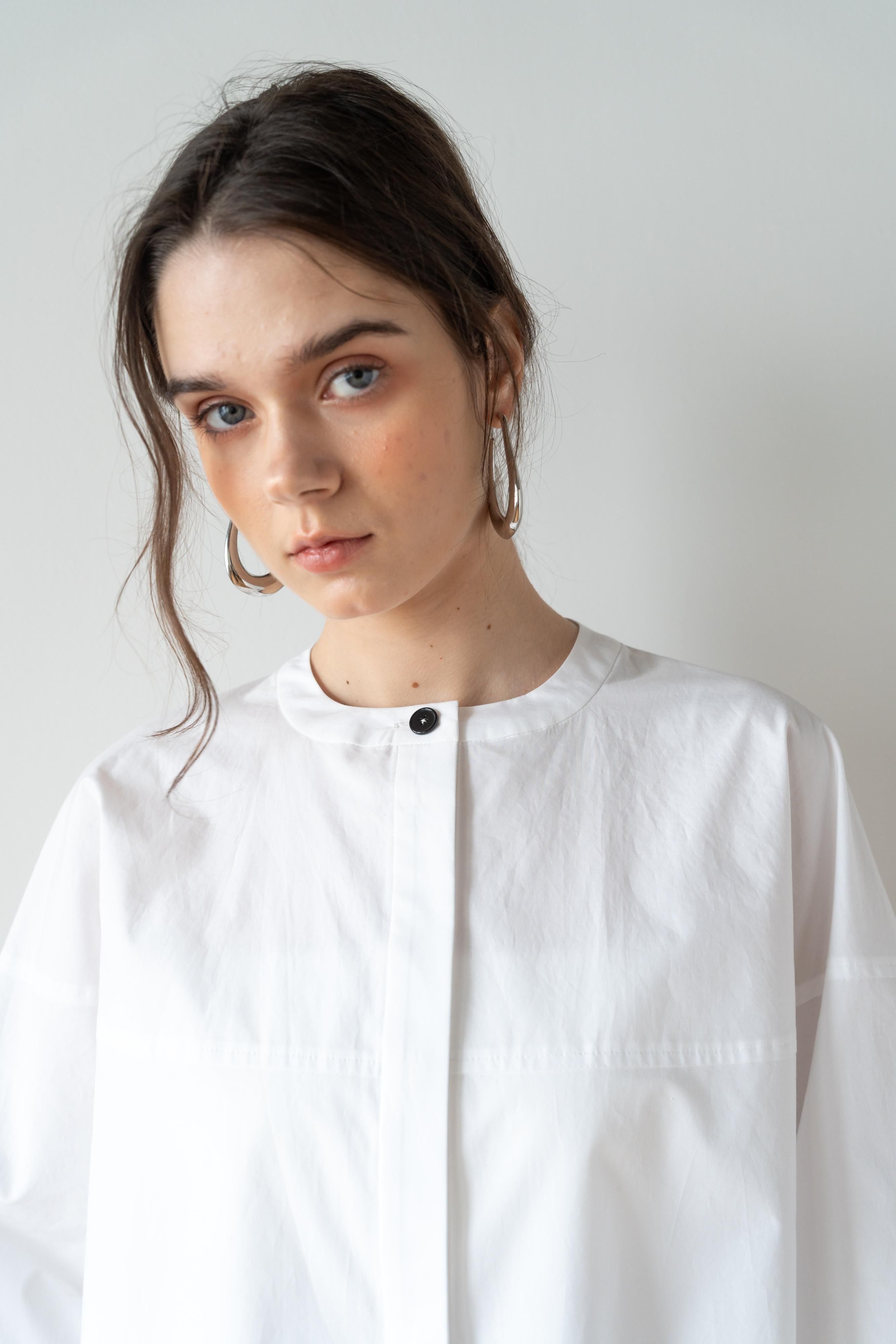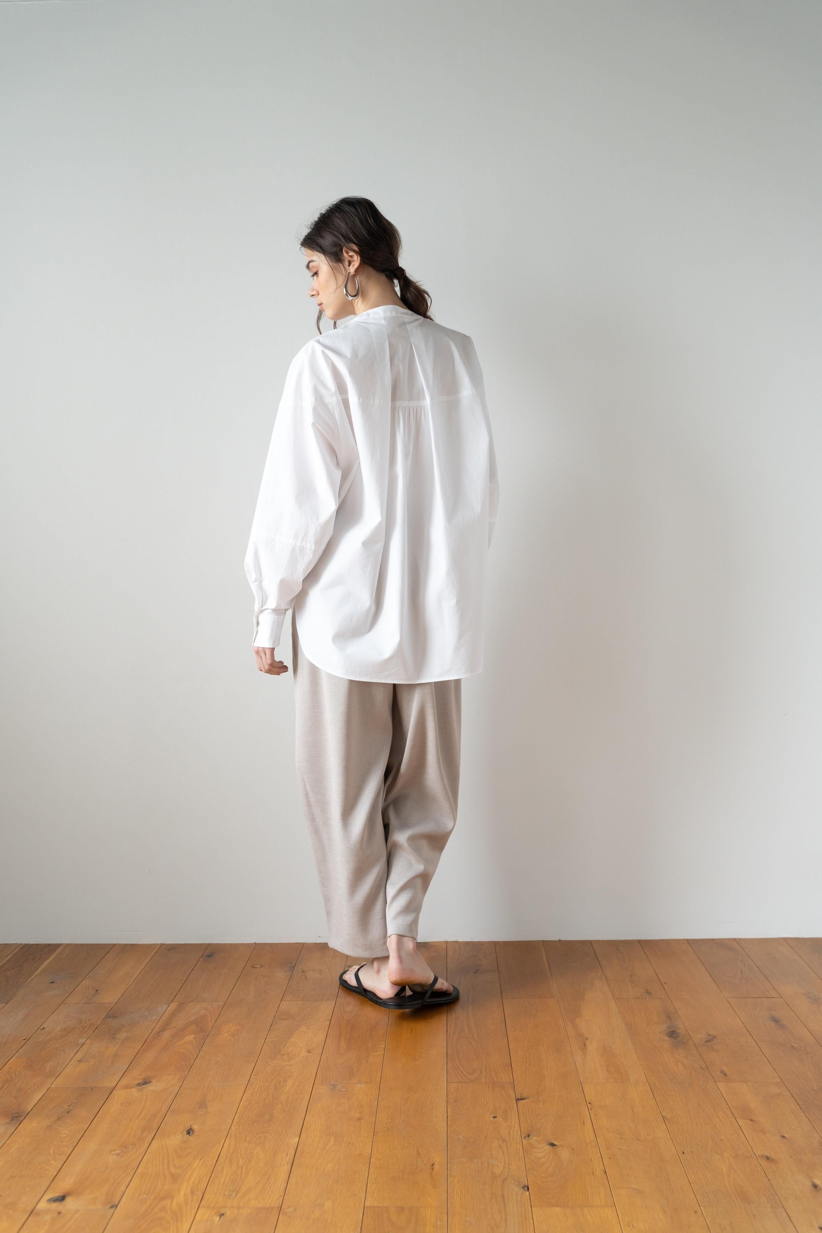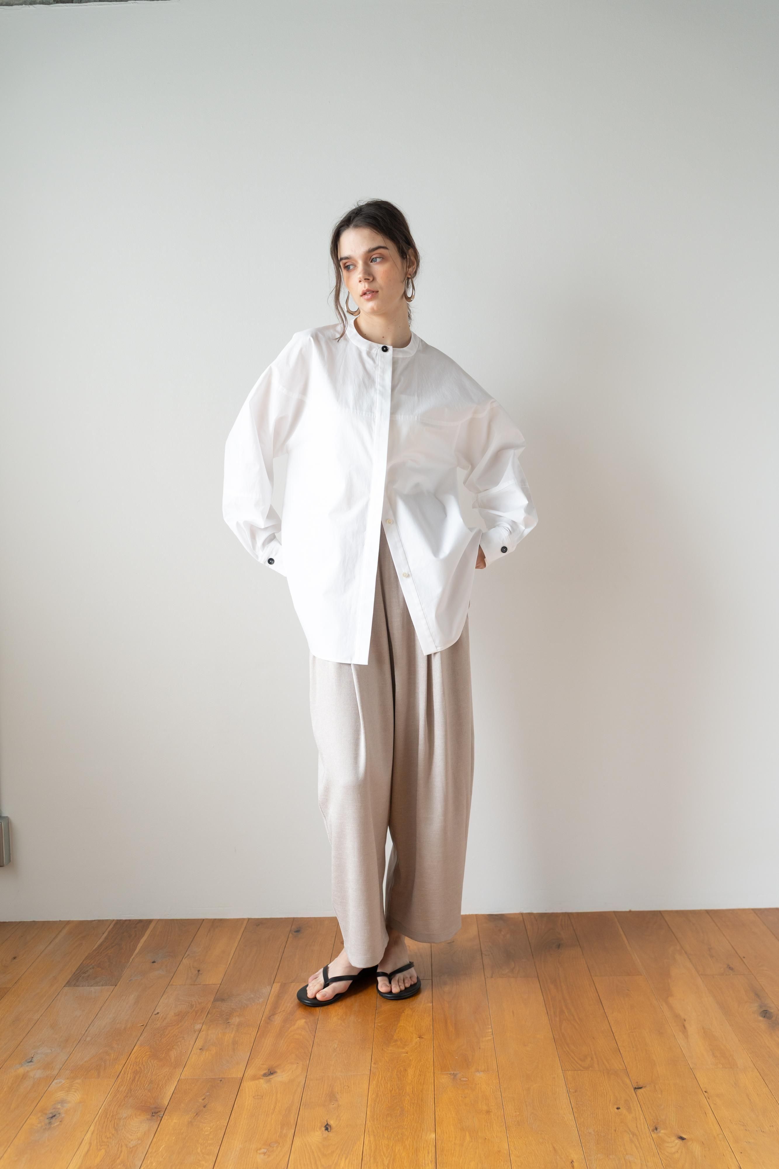 特徴的な黒ボタンがポイントの一枚。オーバーサイズでゆったりとした着心地が魅力で、日本製のコットン生地を使用しているので、肌触りも抜群です。後ろ身頃には深めのタックが入っており、程よい立体感のあるコクーンシルエットに仕上げられています。
