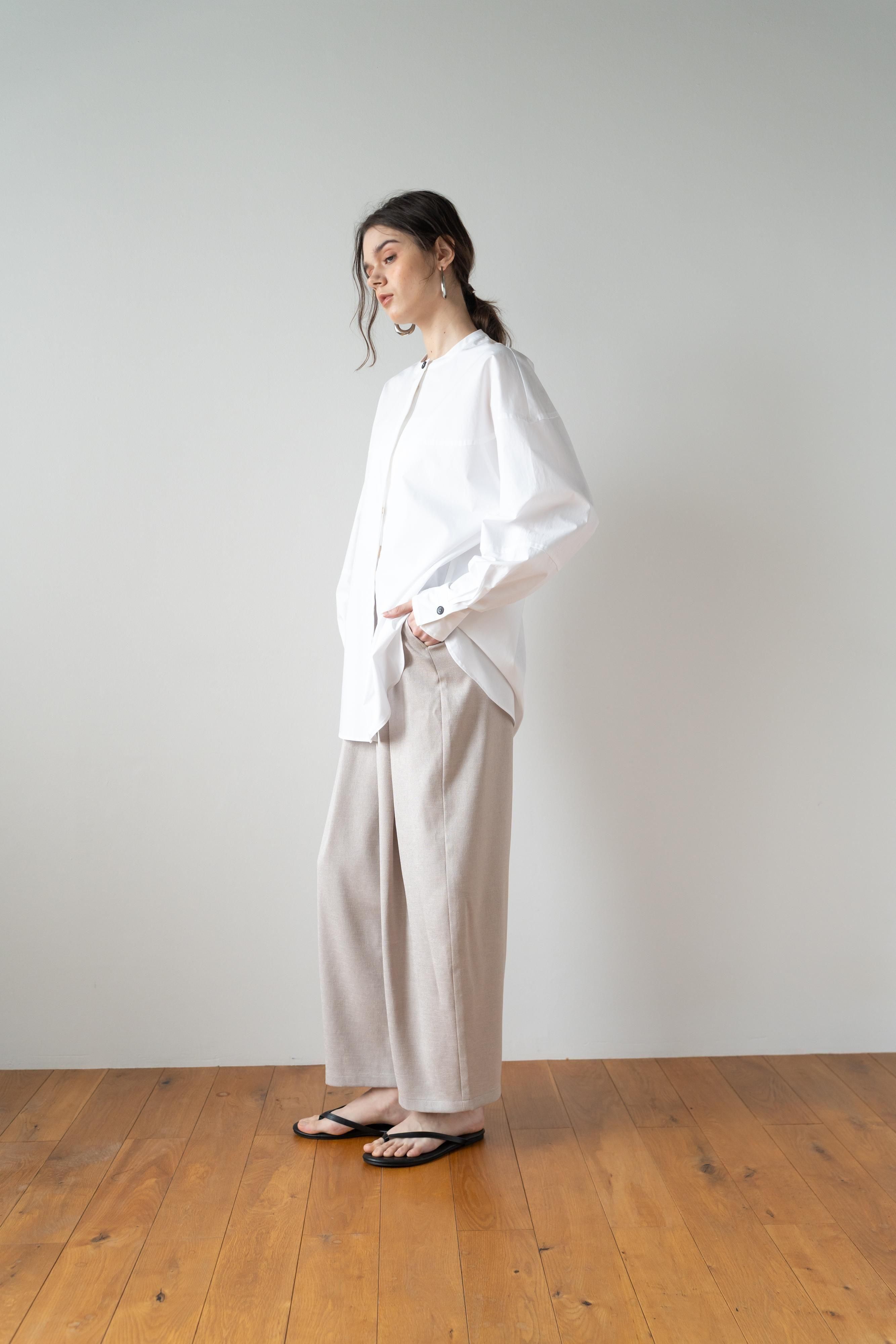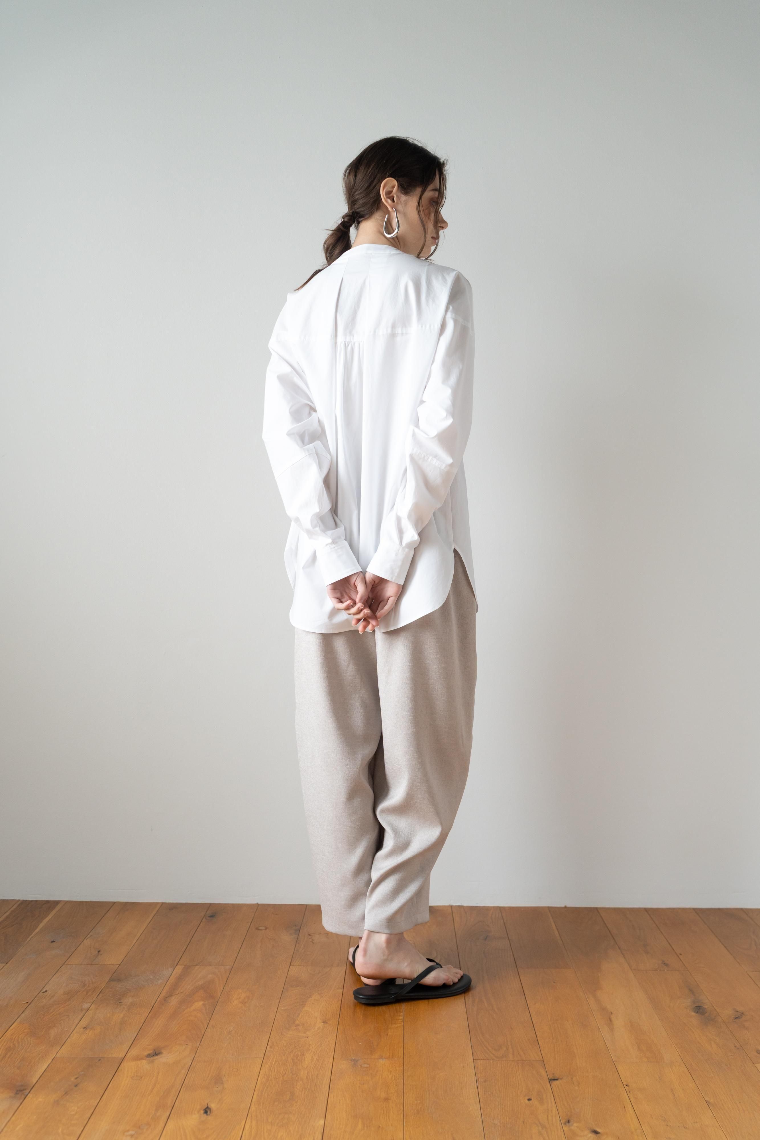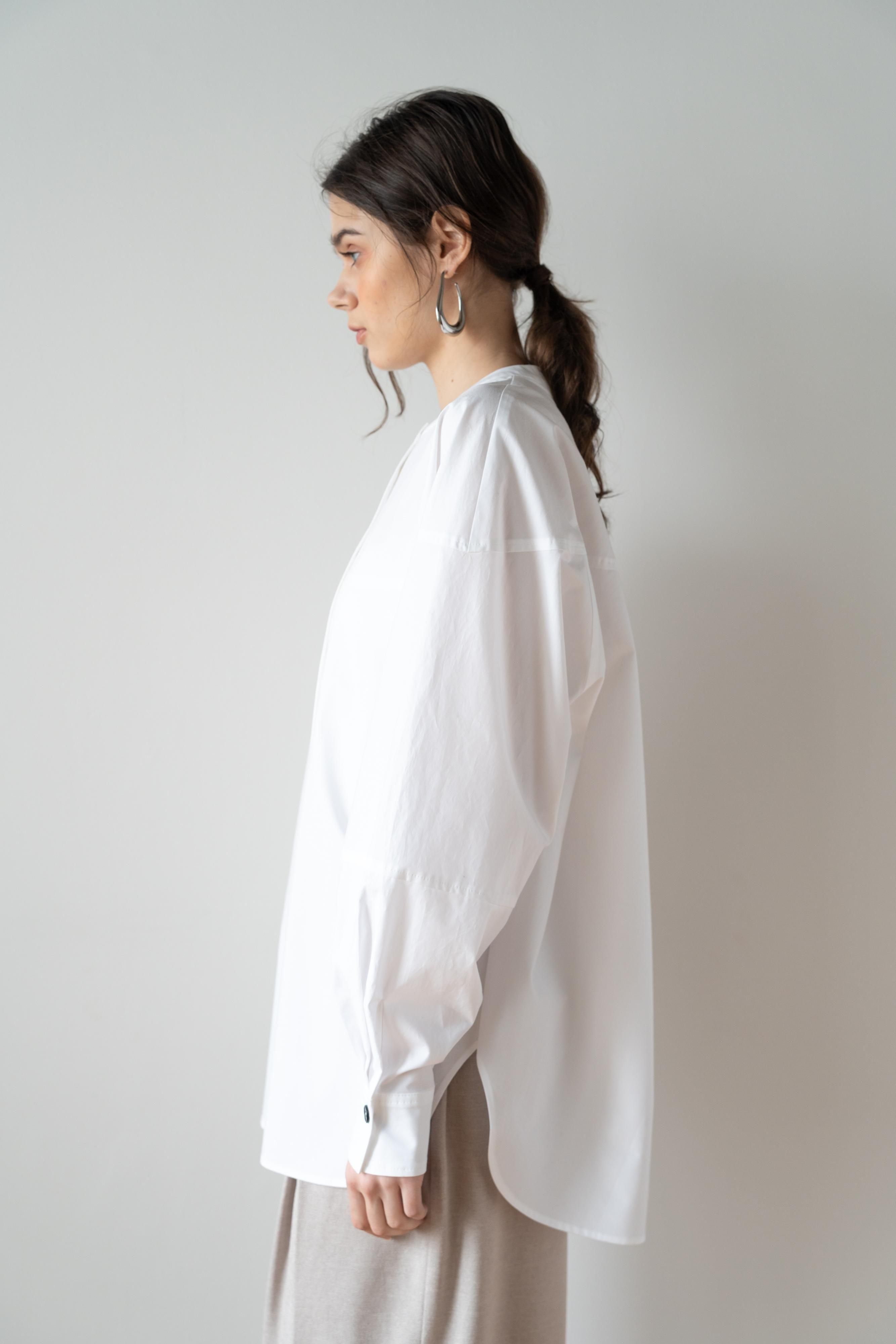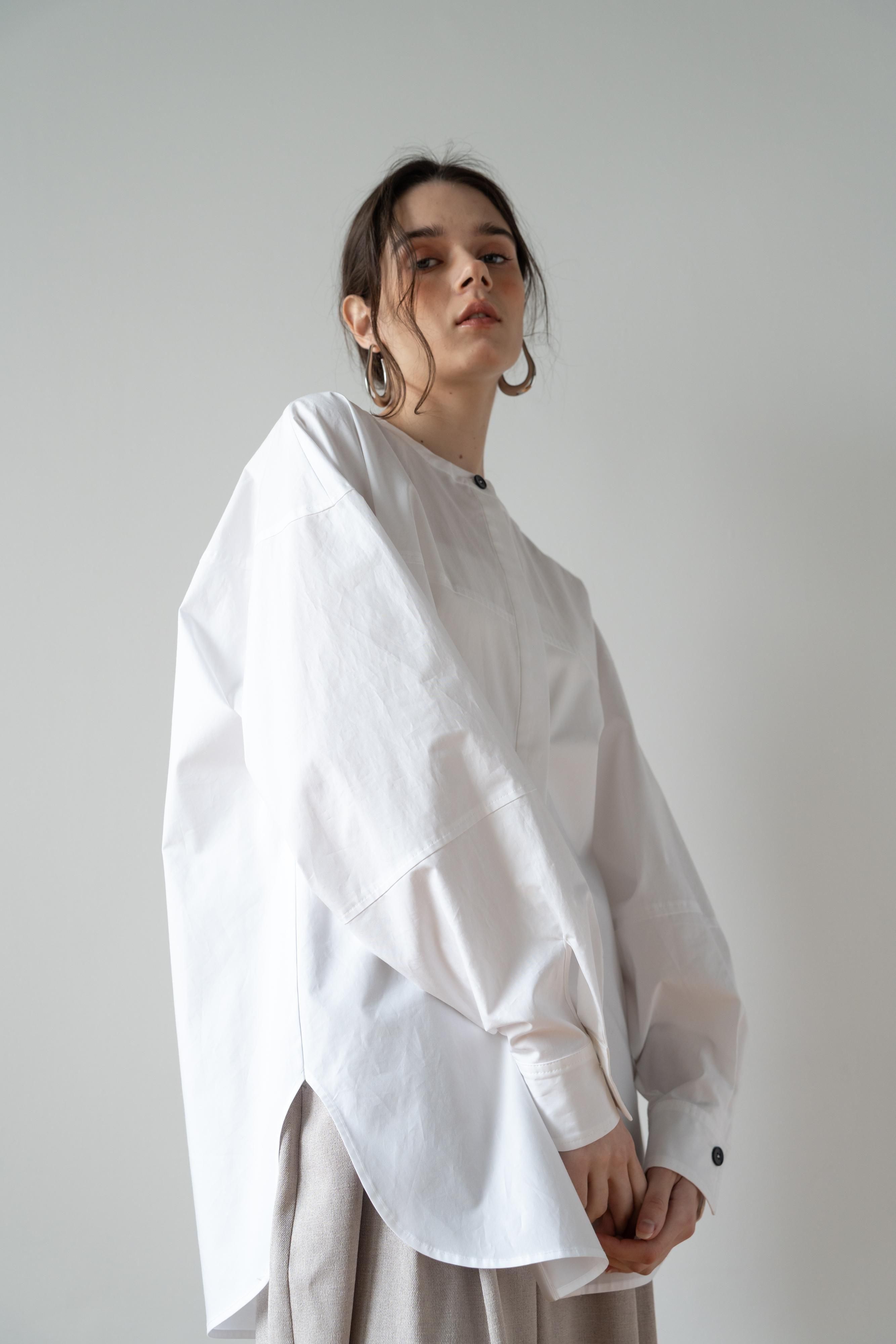 特徴的な黒ボタンがポイントの一枚。オーバーサイズでゆったりとした着心地が魅力で、日本製のコットン生地を使用しているので、肌触りも抜群です。後ろ身頃には深めのタックが入っており、程よい立体感のあるコクーンシルエットに仕上げられています。