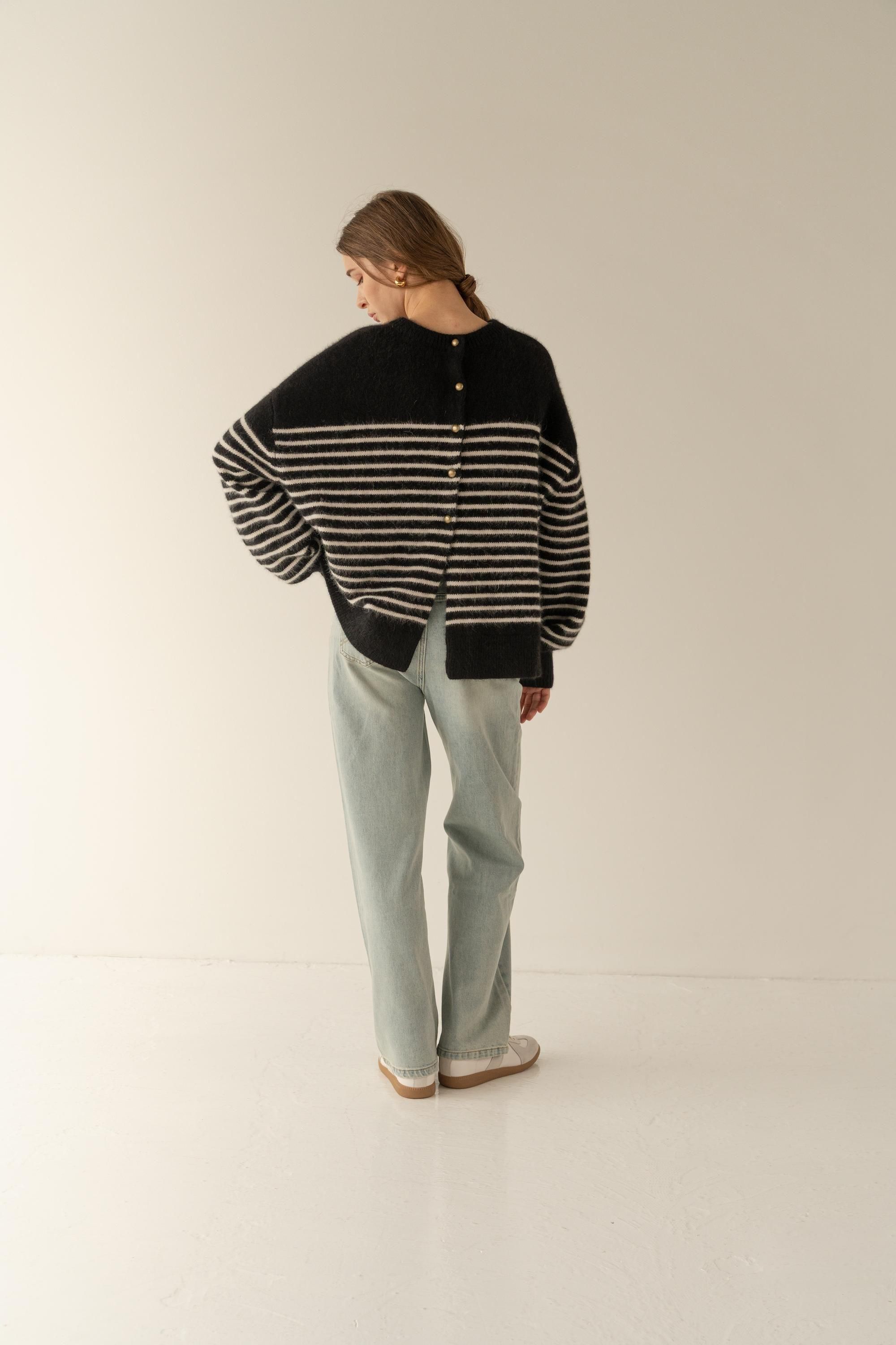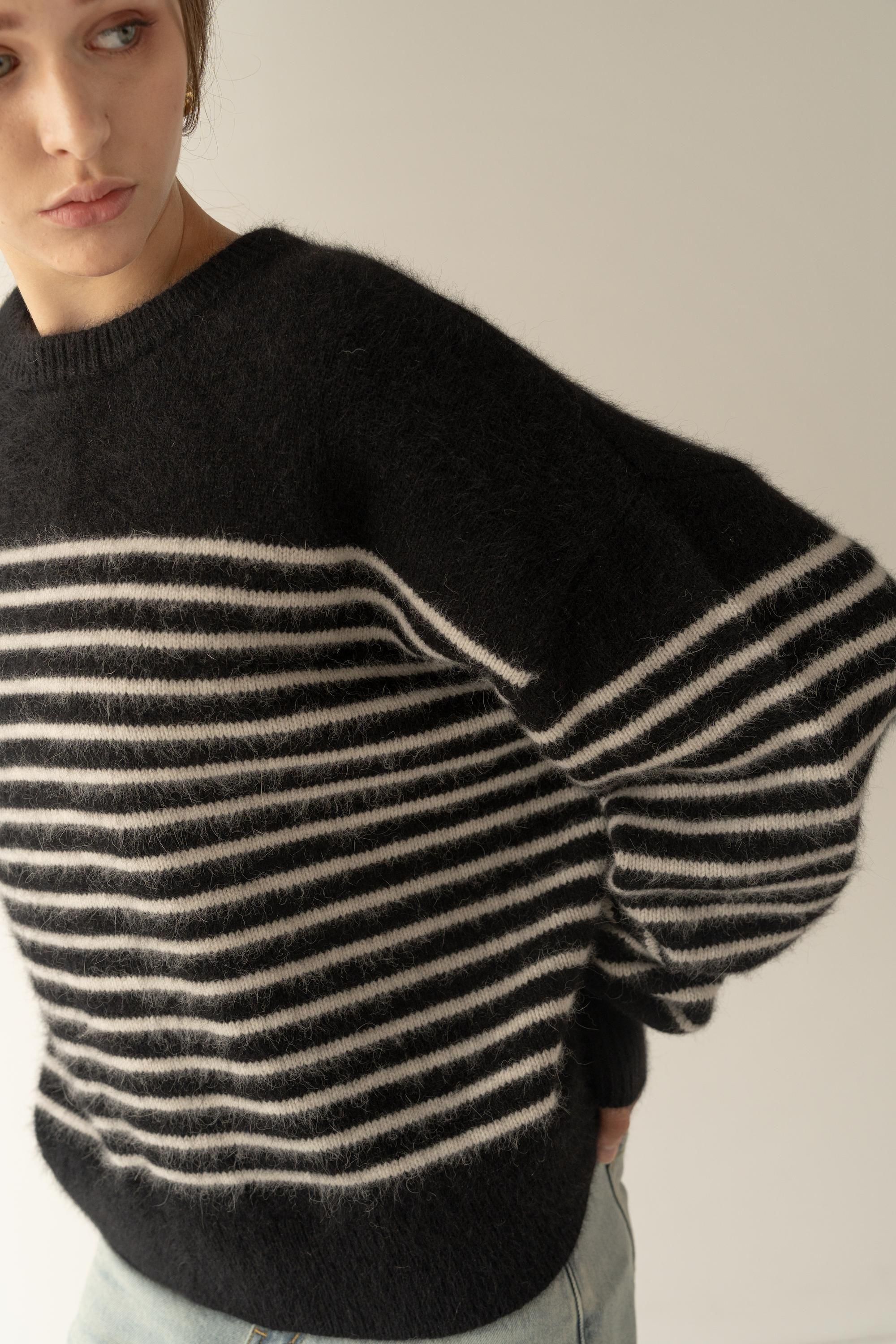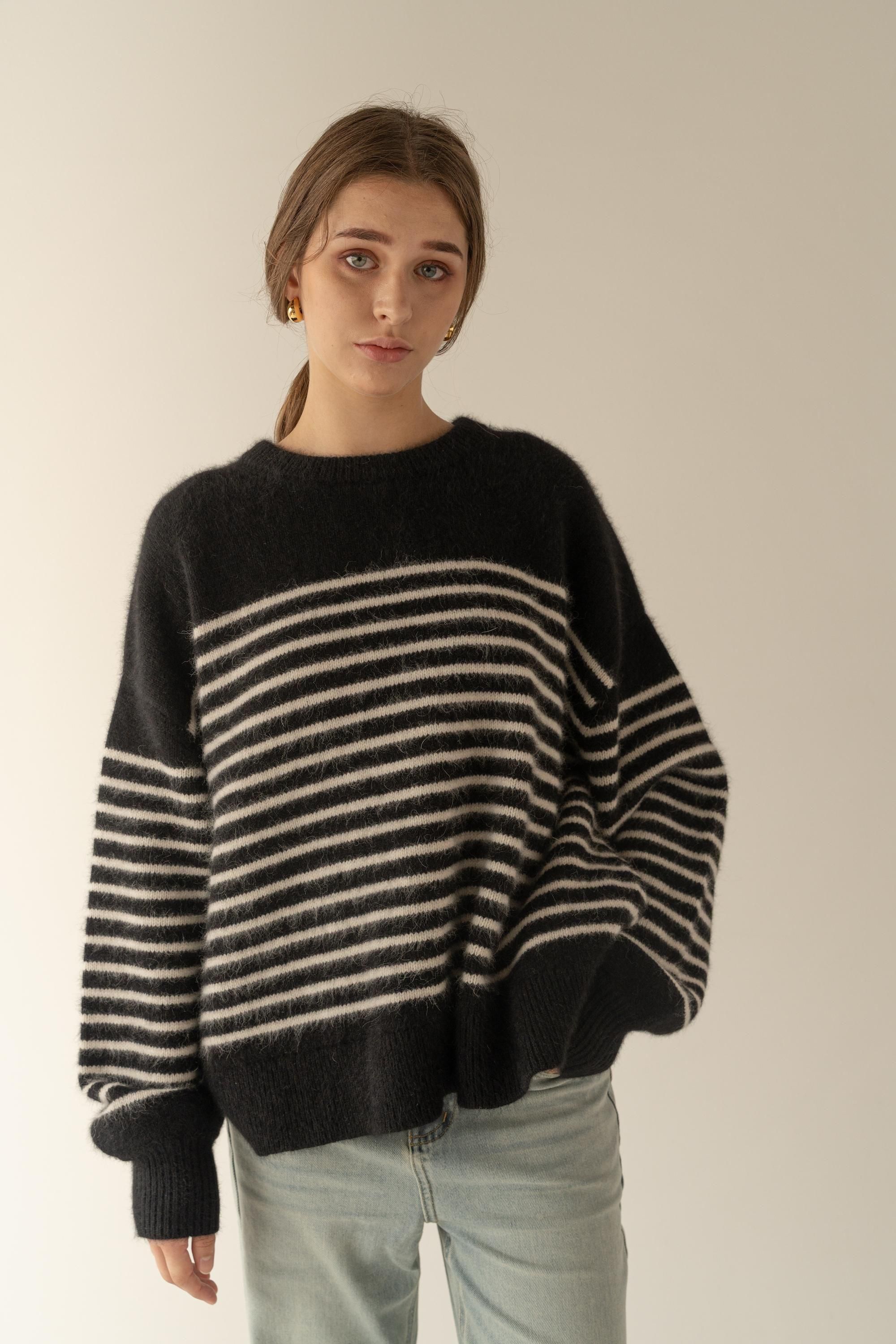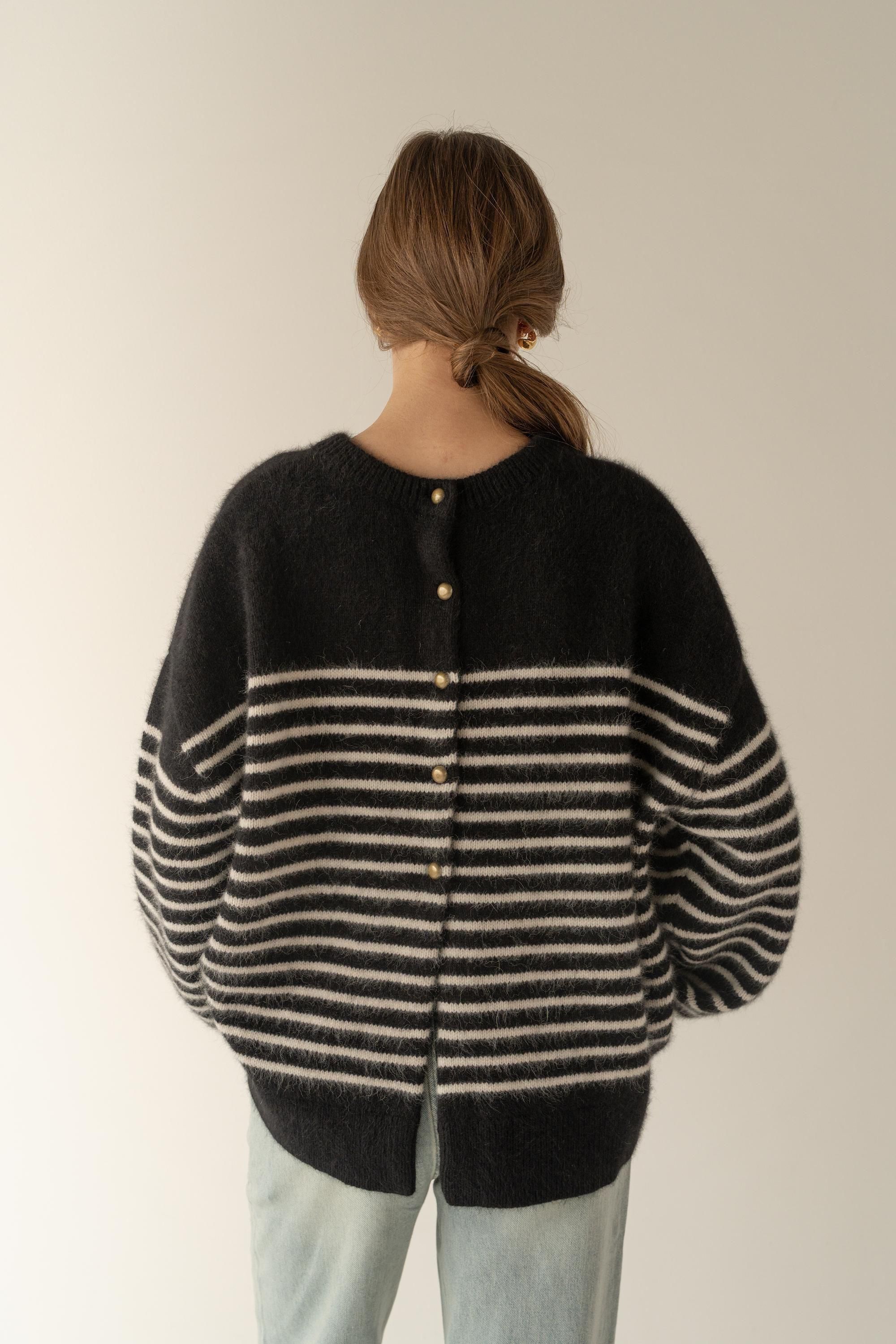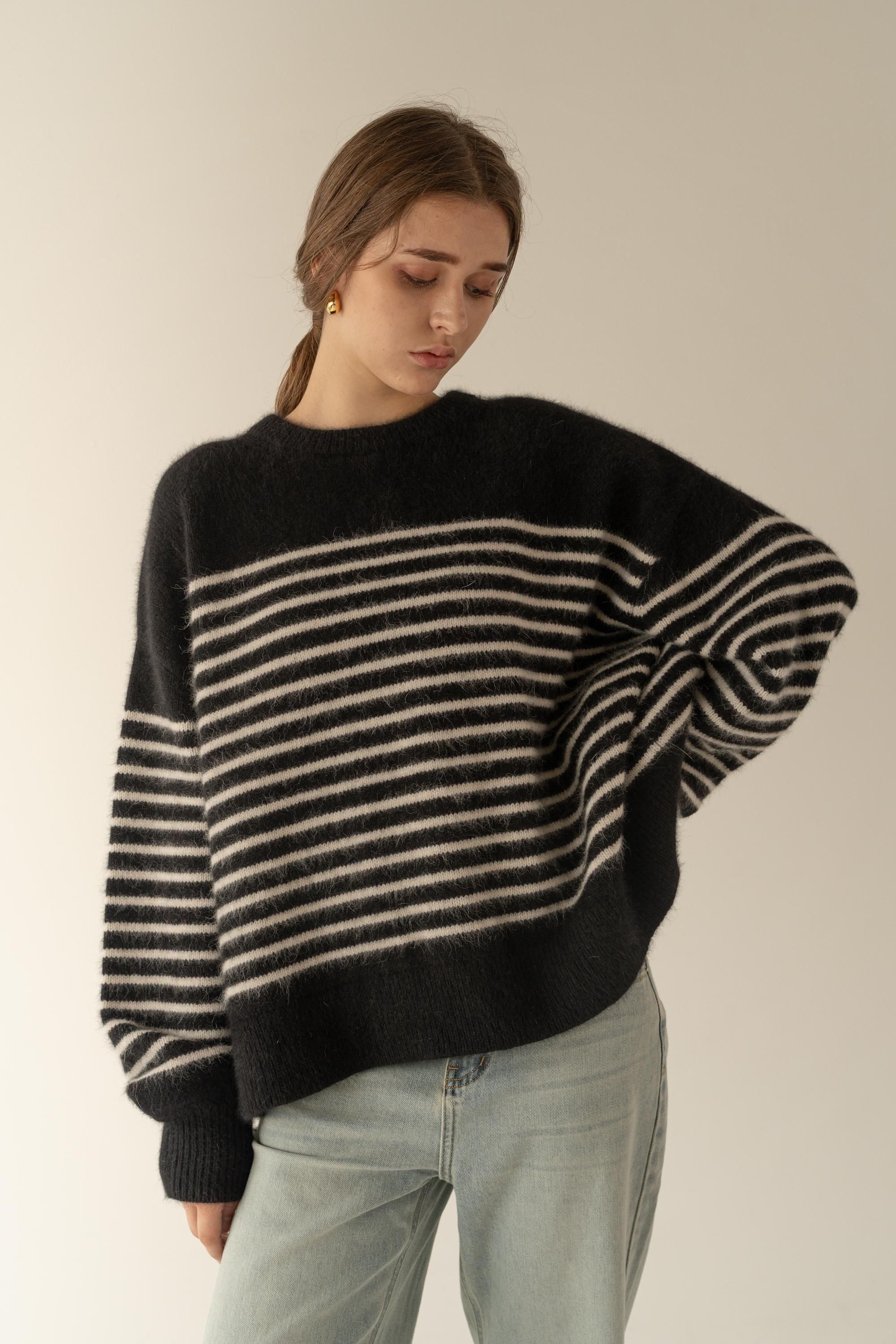 ふんわりとしたラクーン混紡糸で編み立てた、あたたかみのあるニット。
