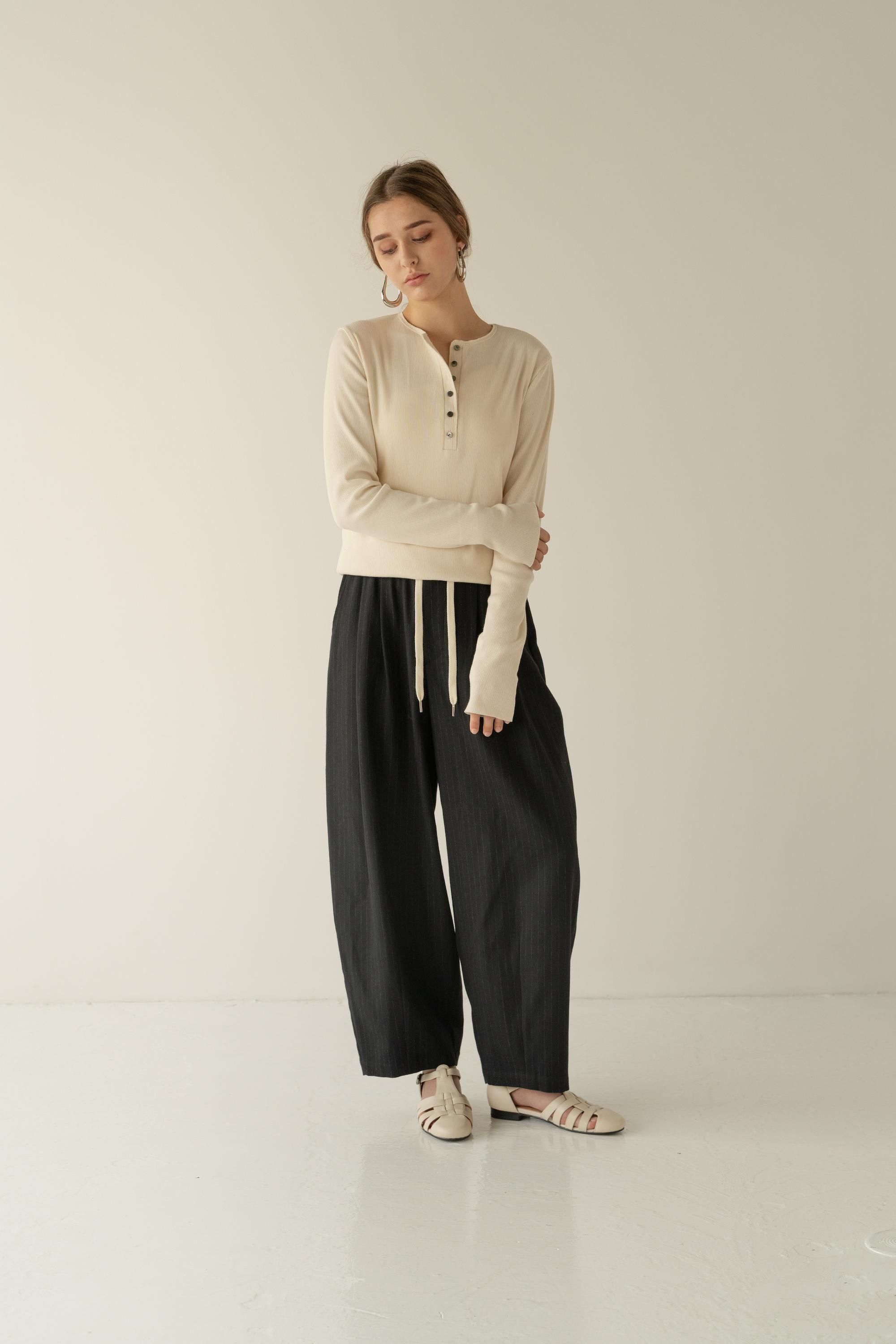 首元のヘンリーネックデザインが抜け感を演出し、カジュアルながらも上品な印象に仕上げています。