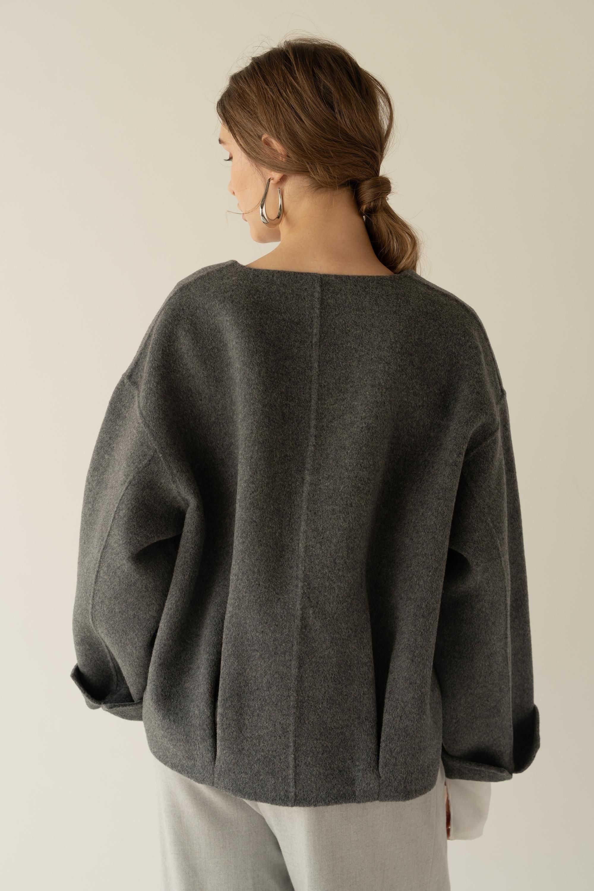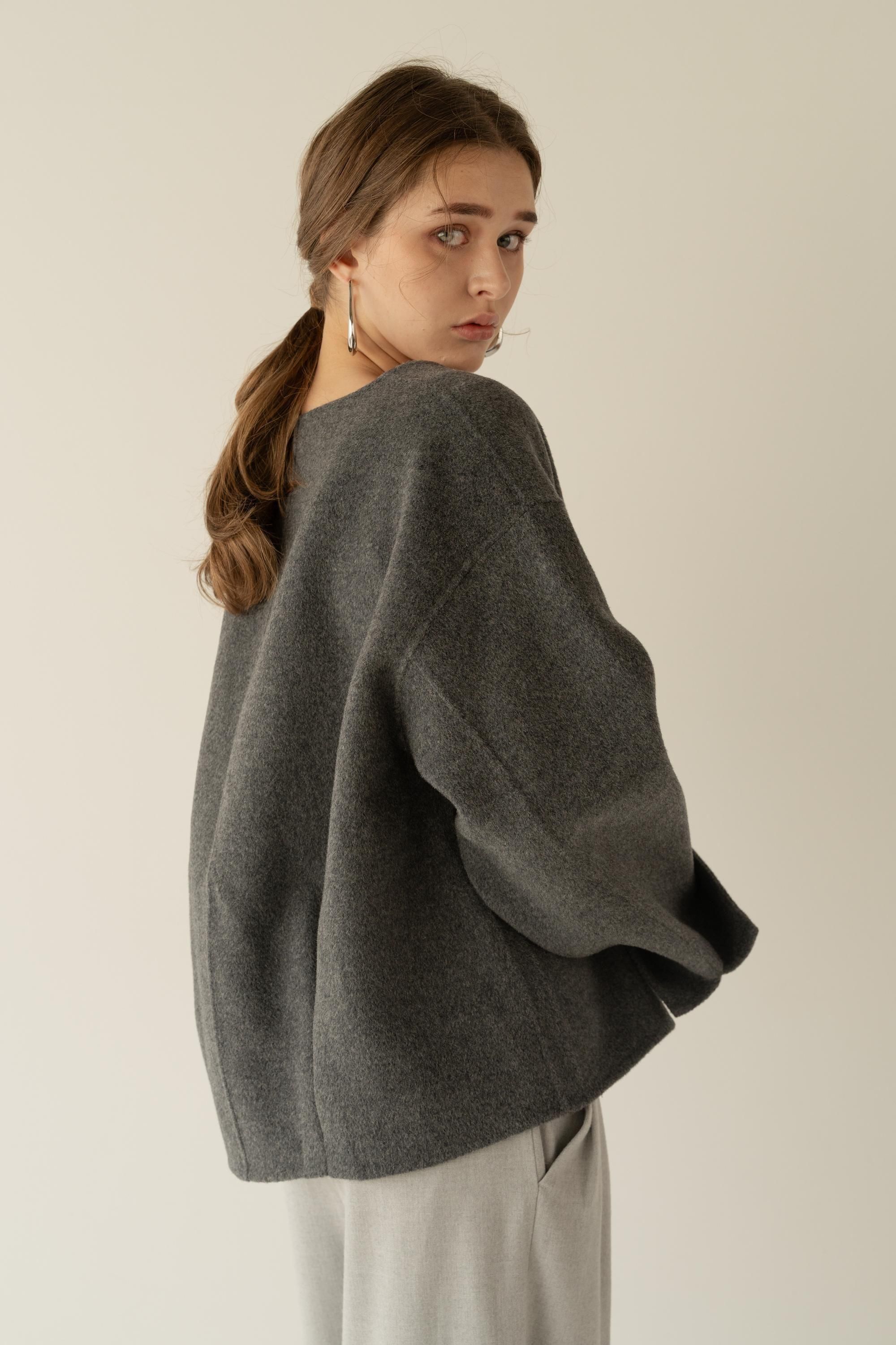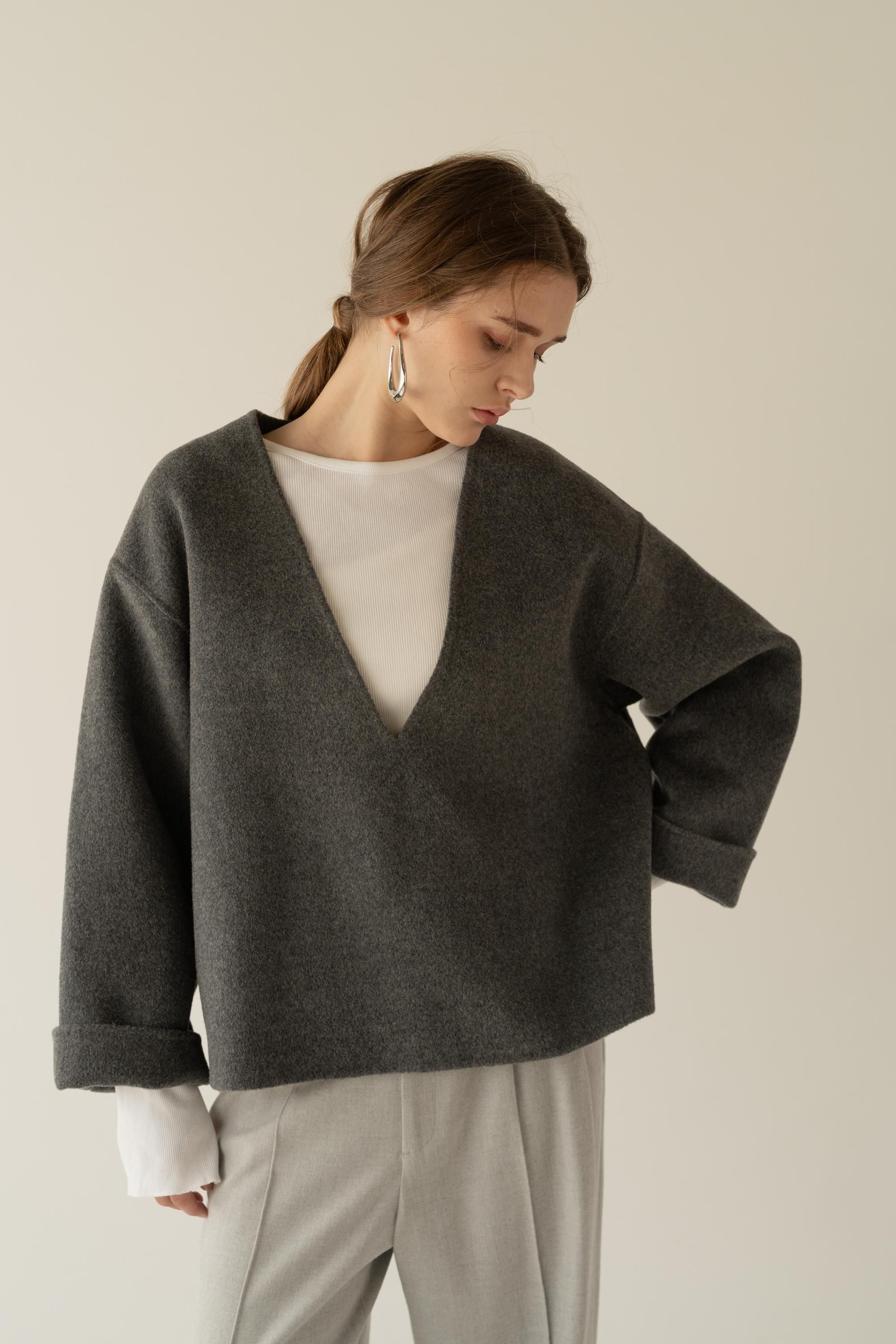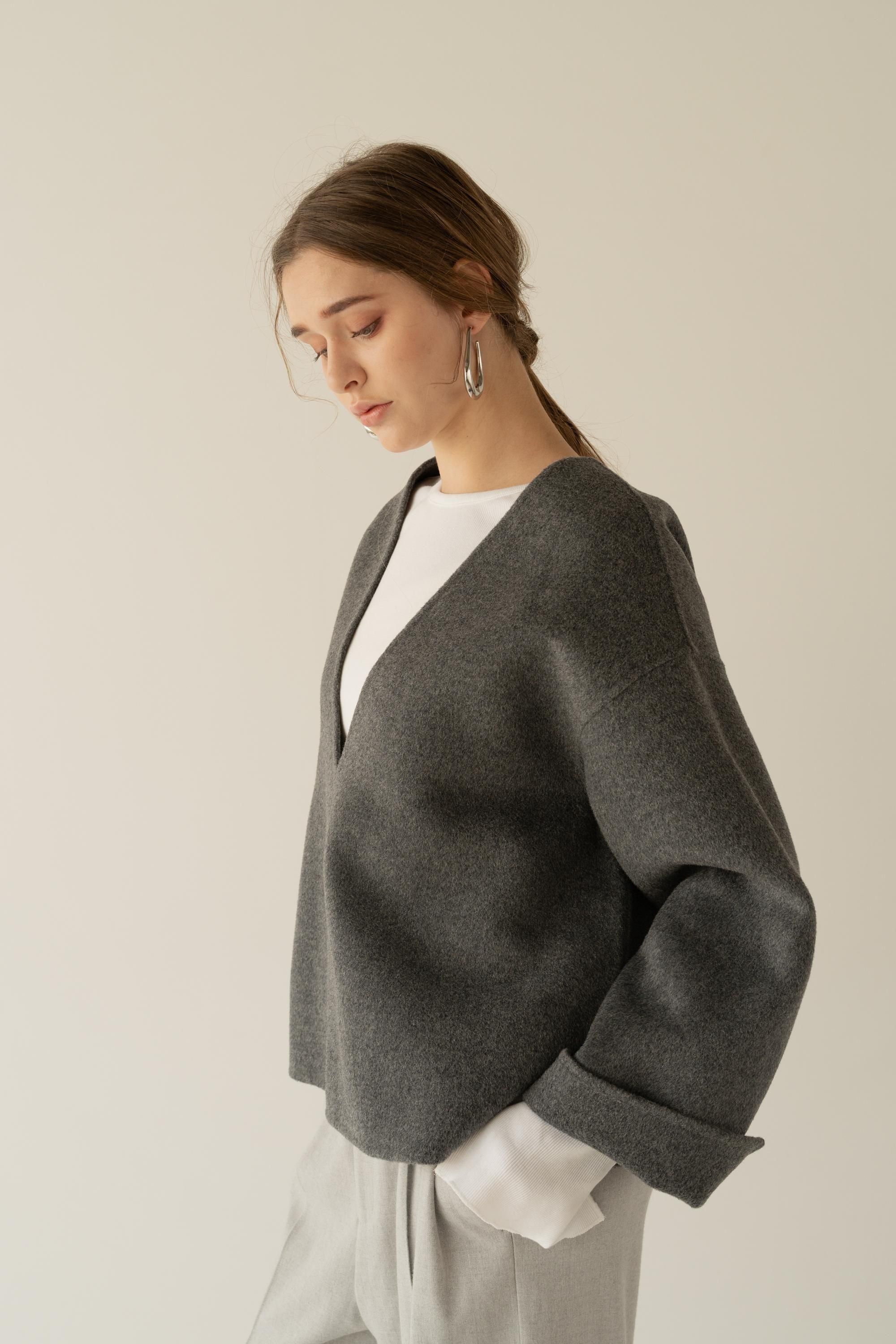 ウール素材を使用したVネックプルオーバーコート。