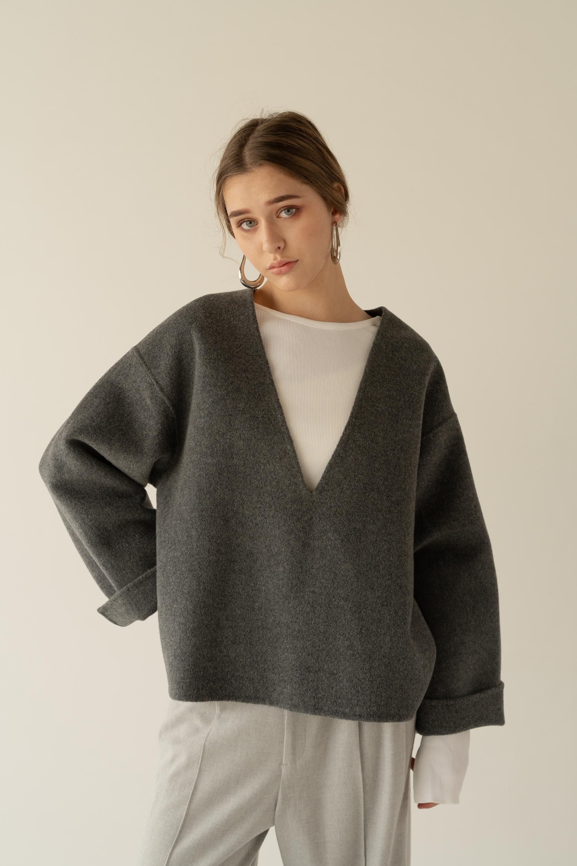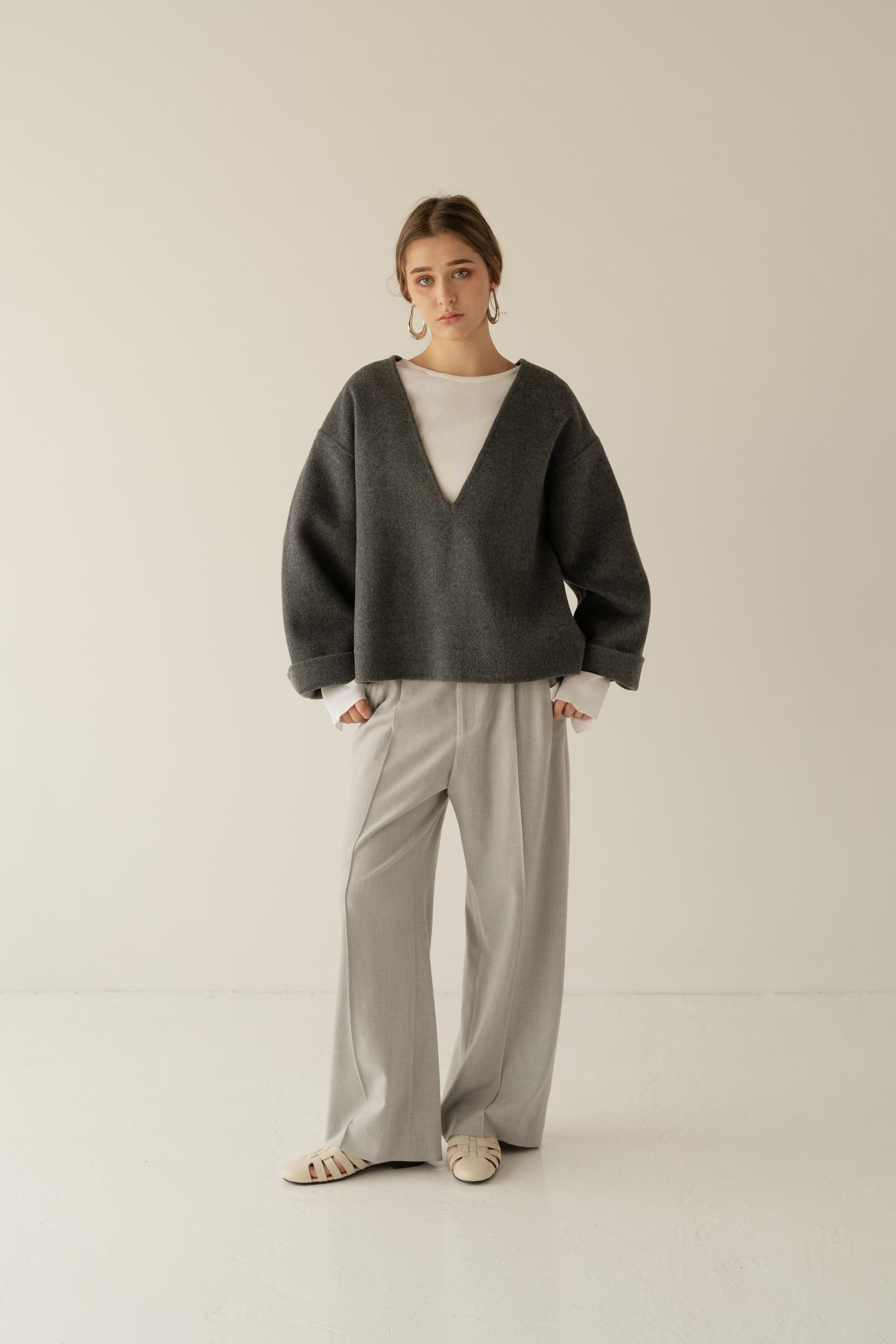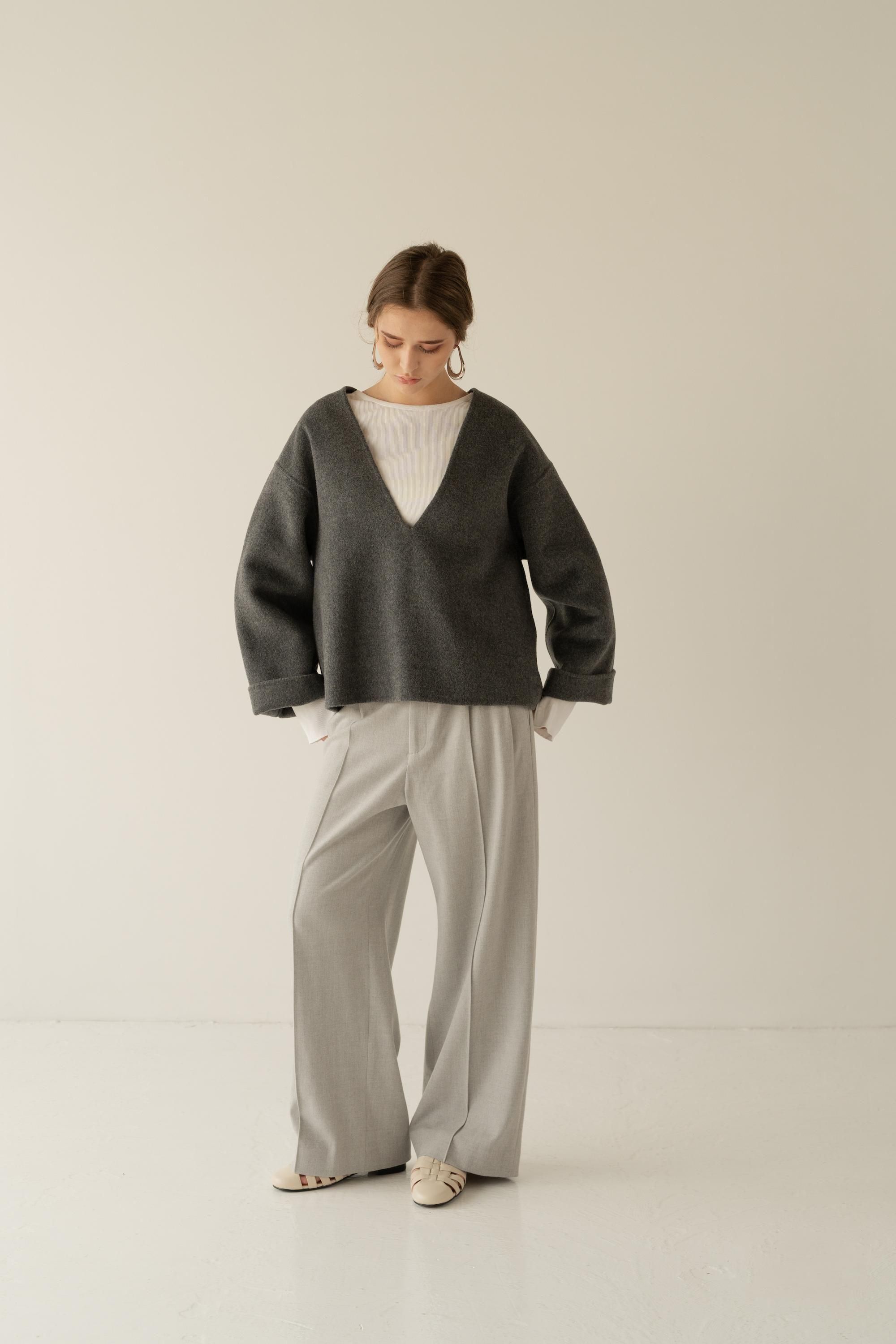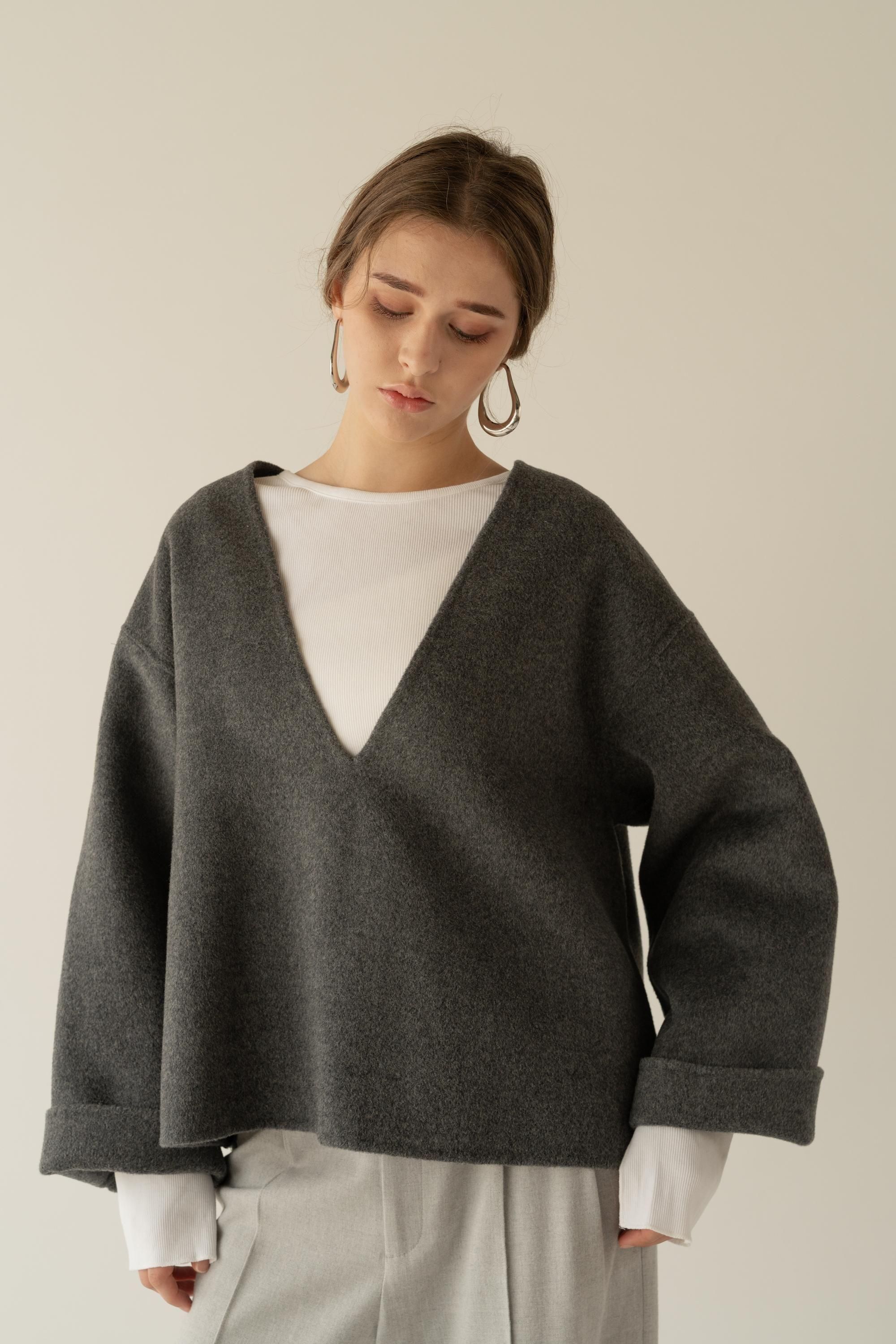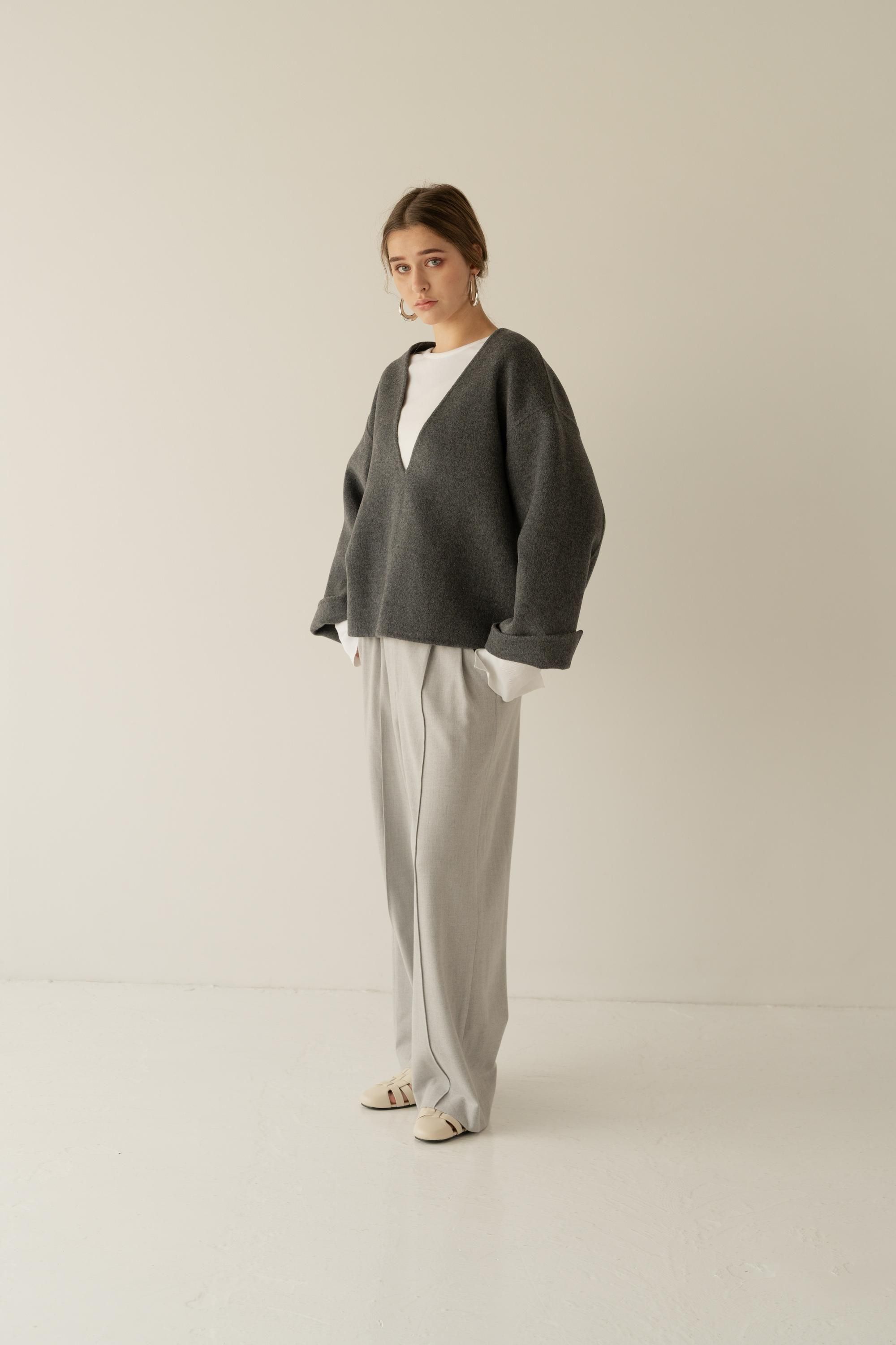 深めのVネックが顔まわりをすっきりと見せ、タートルニットやシャツとのレイヤードも楽しめるデザイン。
